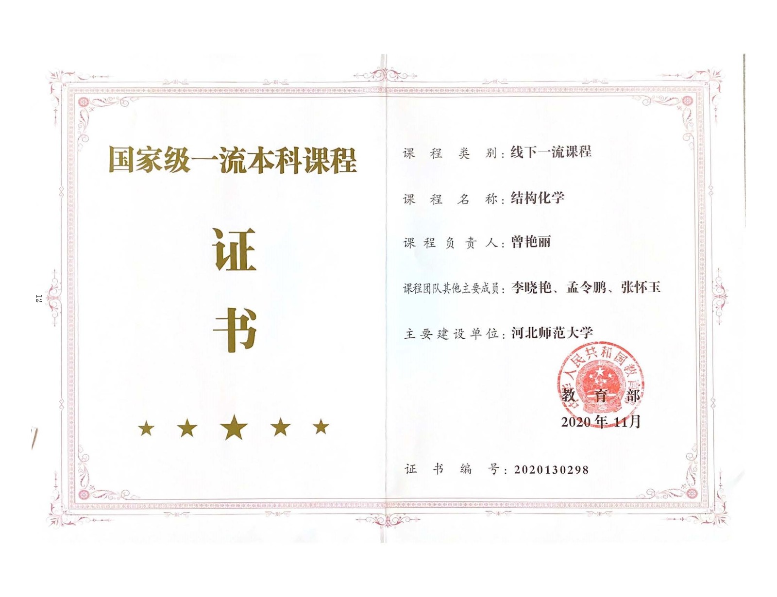 taptap188官网曾艳丽教授团队的结构化学课程荣获国家级一流本科课程