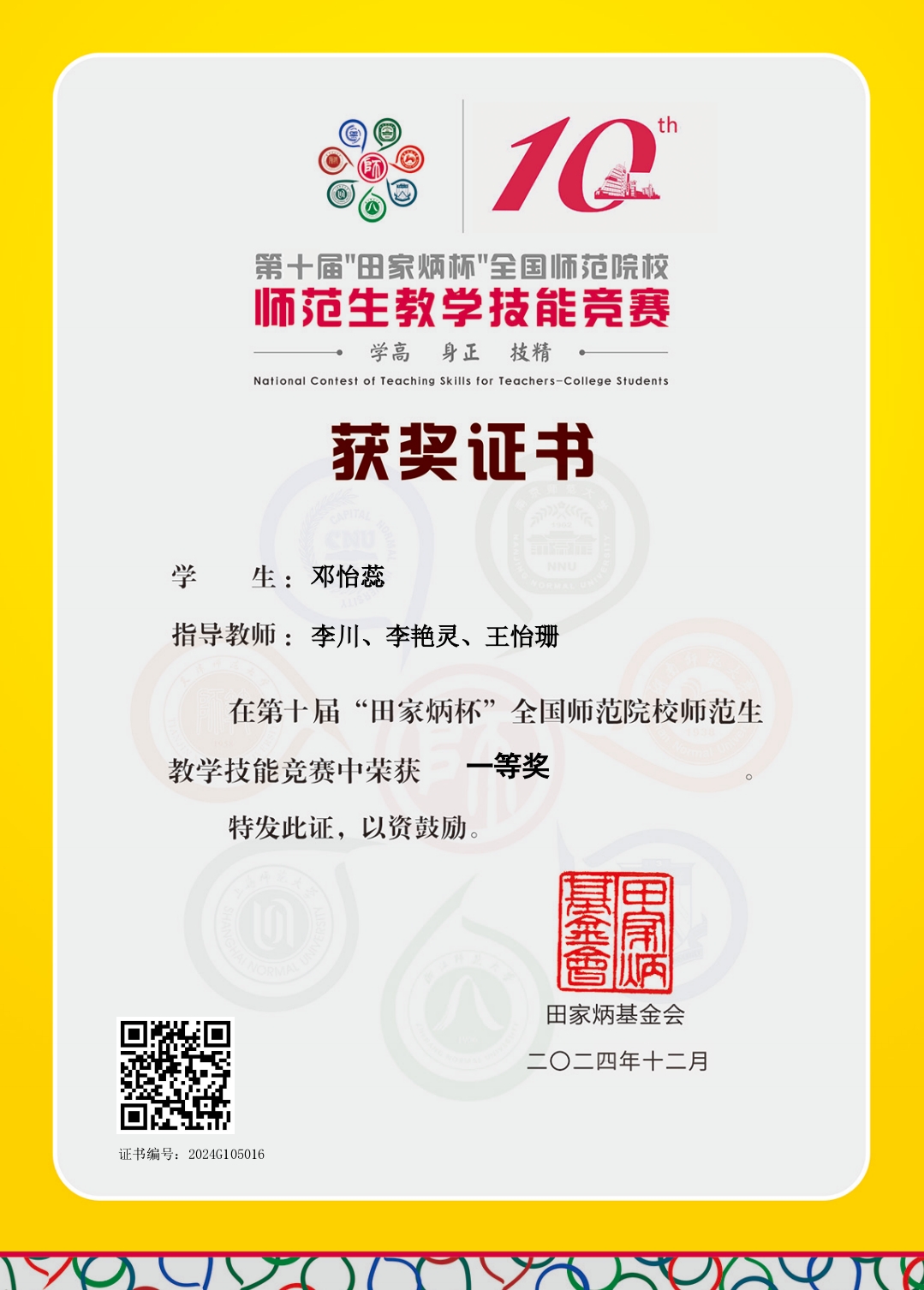 taptap188官网邓怡蕊同学在第十届“田家炳杯”全国师范院校师范生教学技能竞赛中荣获一等奖